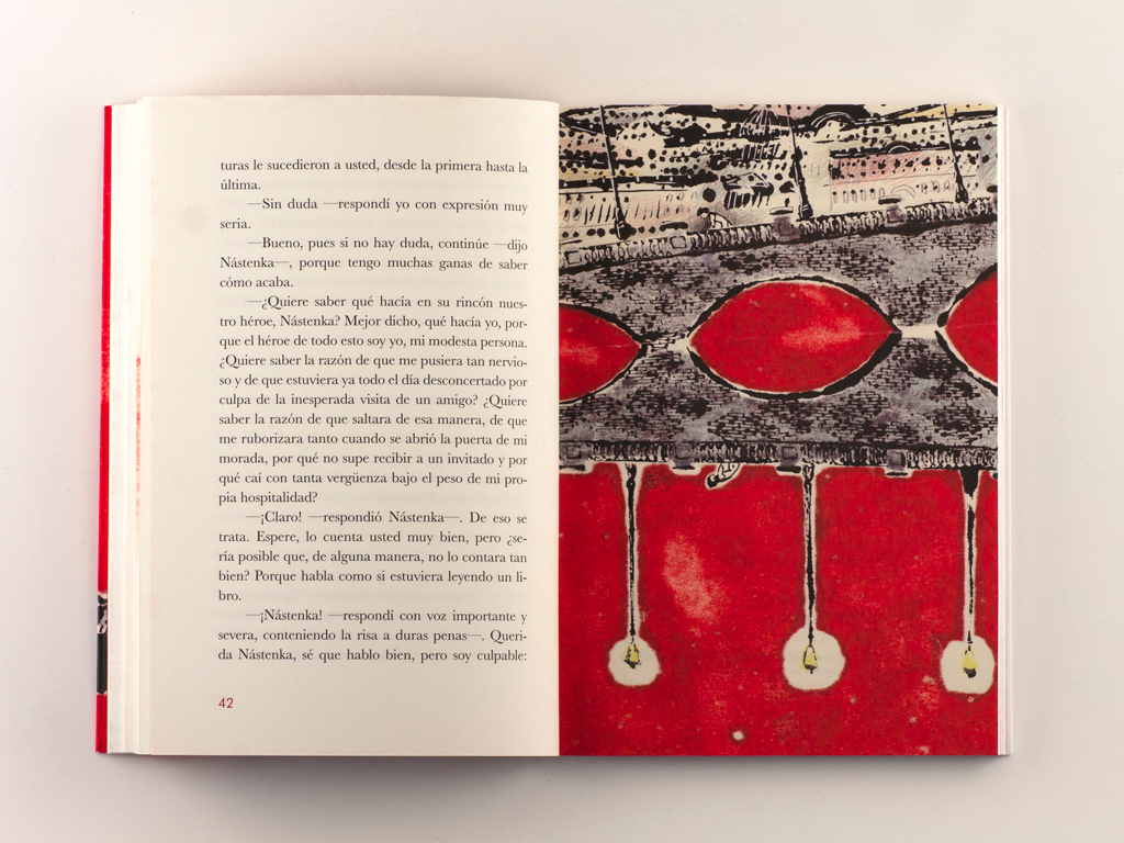 Puesto que se trata de una novela romántica muy pasional abunda el uso del color rojo intenso. Las ilustraciones utilizan un sencillo código de colores donde el mundo de cada personaje está representado por un color: rojo para el protagonista, azul para Nástenka y amarillo para el prometido. A medida que el libro avanza el color rojo va ocupando gradualmente más y más espacio en la página.