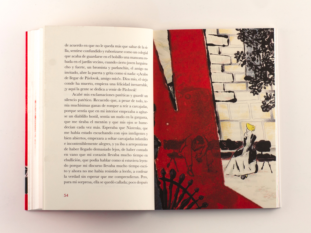 Comme il s'agit d'un roman d'amour trés passionel il y a une abundance de couleur rouge intense. Les illustrations utilisent un code de couleurs simple, où chaque personnage est representé par une couleur: rouge pour le narrateur, bleu pour Nastenka et jaune pour son fiancé. A mesure que le livre avance le rouge prends de plus en plus espace dans la page.